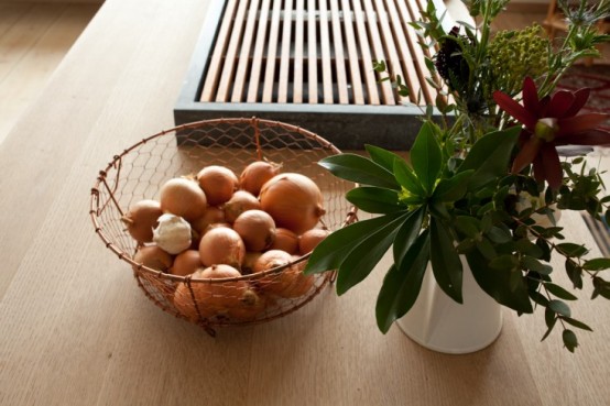 Trong bếp có rất nhiều đồ đạc và dụng cụ để phục vụ cho việc nấu nướng như dao, thớt, muôi… Tuy vậy nhờ nghệ thuật sắp đặt và bài trí theo khuôn khổ mà căn bếp rất trật tự và ngăn nắp.