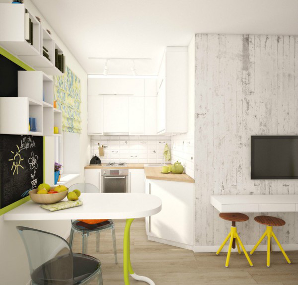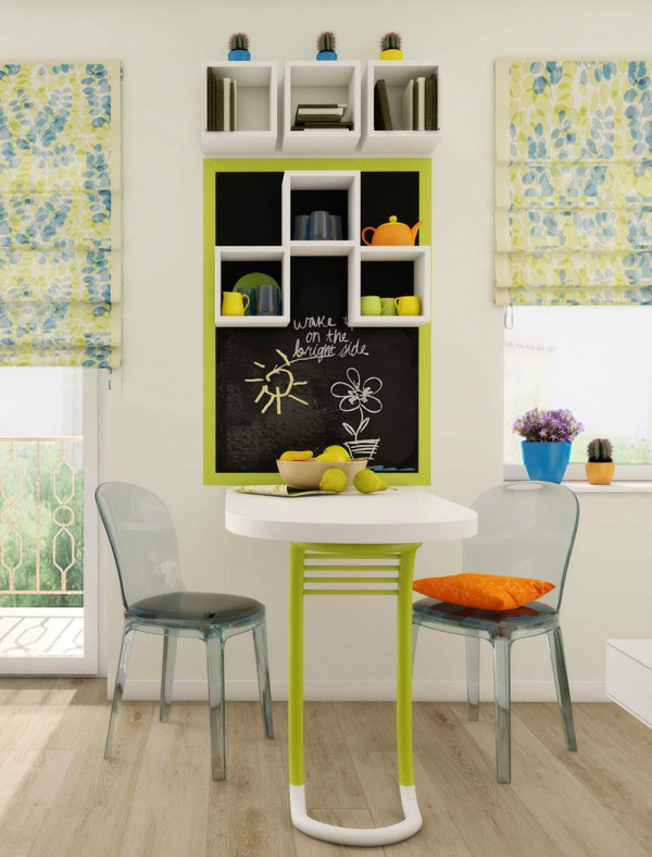 Để tiết kiệm diện tích, một điều bàn ăn được gắn vào tường. Sự kết hợp của màu trắng với màu xanh lá khiến bàn ăn nhỏ thêm ngọt ngào.