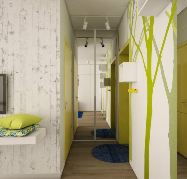 Để tăng thêm không gian lưu trữ, ở cuối hành lang dẫn vào nhà tắm và cửa nhà bố trí một tủ quần áo nhỏ với cửa gương rất tiện.