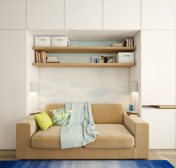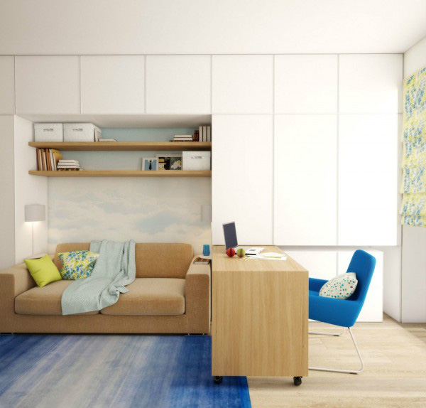 Decal màu xanh nhạt và gương cộng với tấm thảm màu xanh biển ở khu vực tiếp khách đã thêm màu sắc cho căn hộ.Tiếp đến là vấn đề lưu trữ. Đây là một vấn đề khá đau đầu trong các không gian nhỏ, tuy nhiên ở đây nó đã được xử lý rất khéo bằng một hệ kệ lớn ốp kín một bức tường. Với thiết kế cửa cánh phẳng và màu sơn trắng, chiếc tủ lớn này đã ẩn mình một cách hoàn hảo trong căn hộ nhỏ.