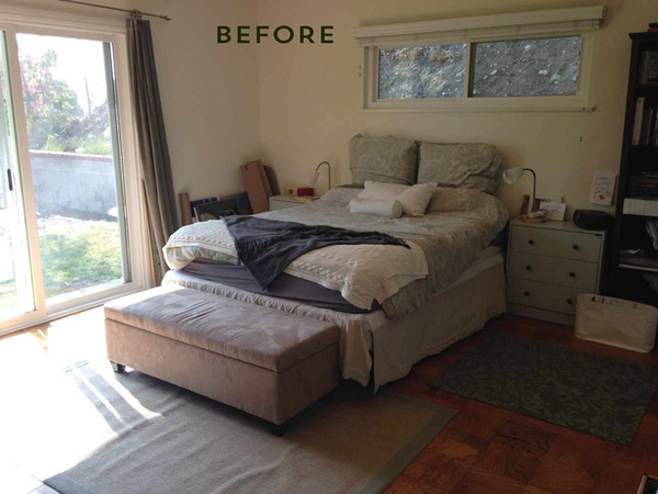 Trước khi cải tạo, phòng ngủ khá u ám. Bộ chăn ga gối cùng những tấm thảm màu ghi nhạt đặt trên nền sàn gỗ nâu đậm khiến căn phòng trở nên nặng nề dù nó sở hữu cửa sổ kính lớn nhìn ra khu vườn.